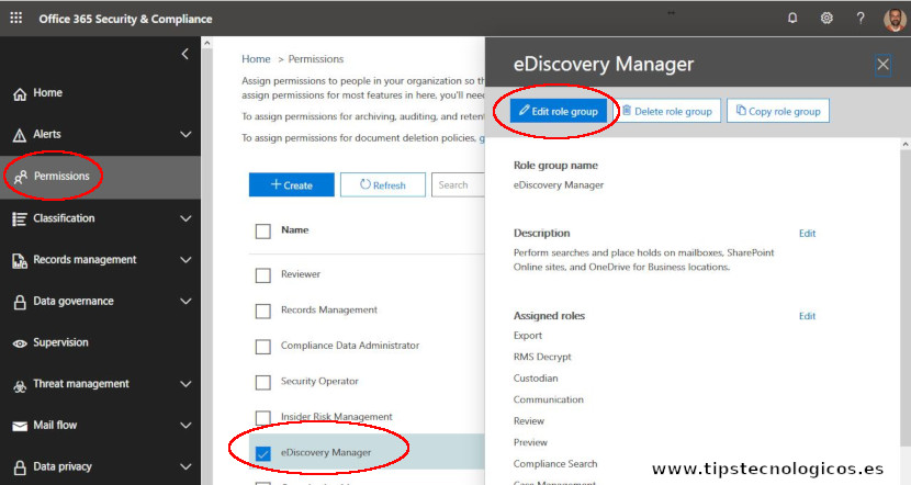 Para poder realizar la exportación nuestro usuario debe ser administrador de eDiscover. Para ello nos iremos a Permissions, eDiscovery Manager y editaremos los roles del grupo.