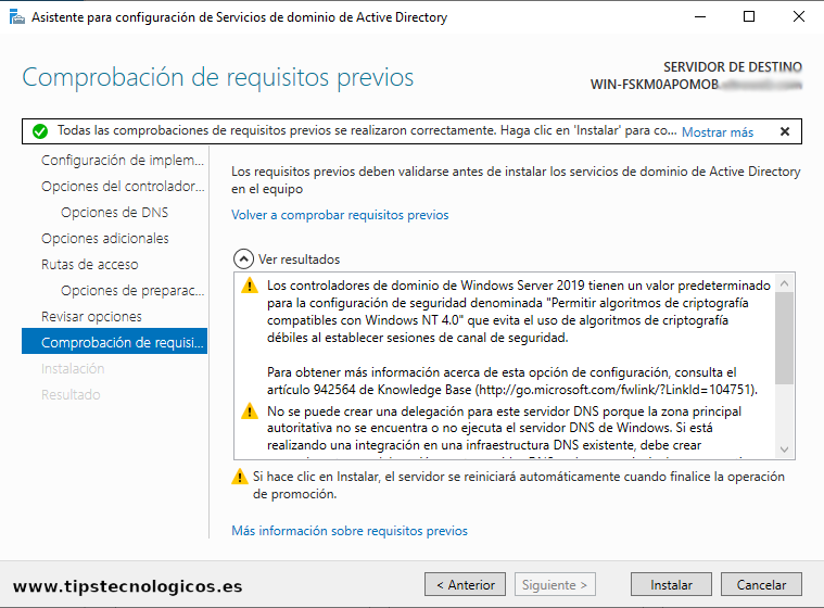 Realizamos una comprobación de requisitos previos para verificar que los cumplimos y pulsamos en Instalar para finalizar la promoción de nuestro nuevo controlador de dominio.